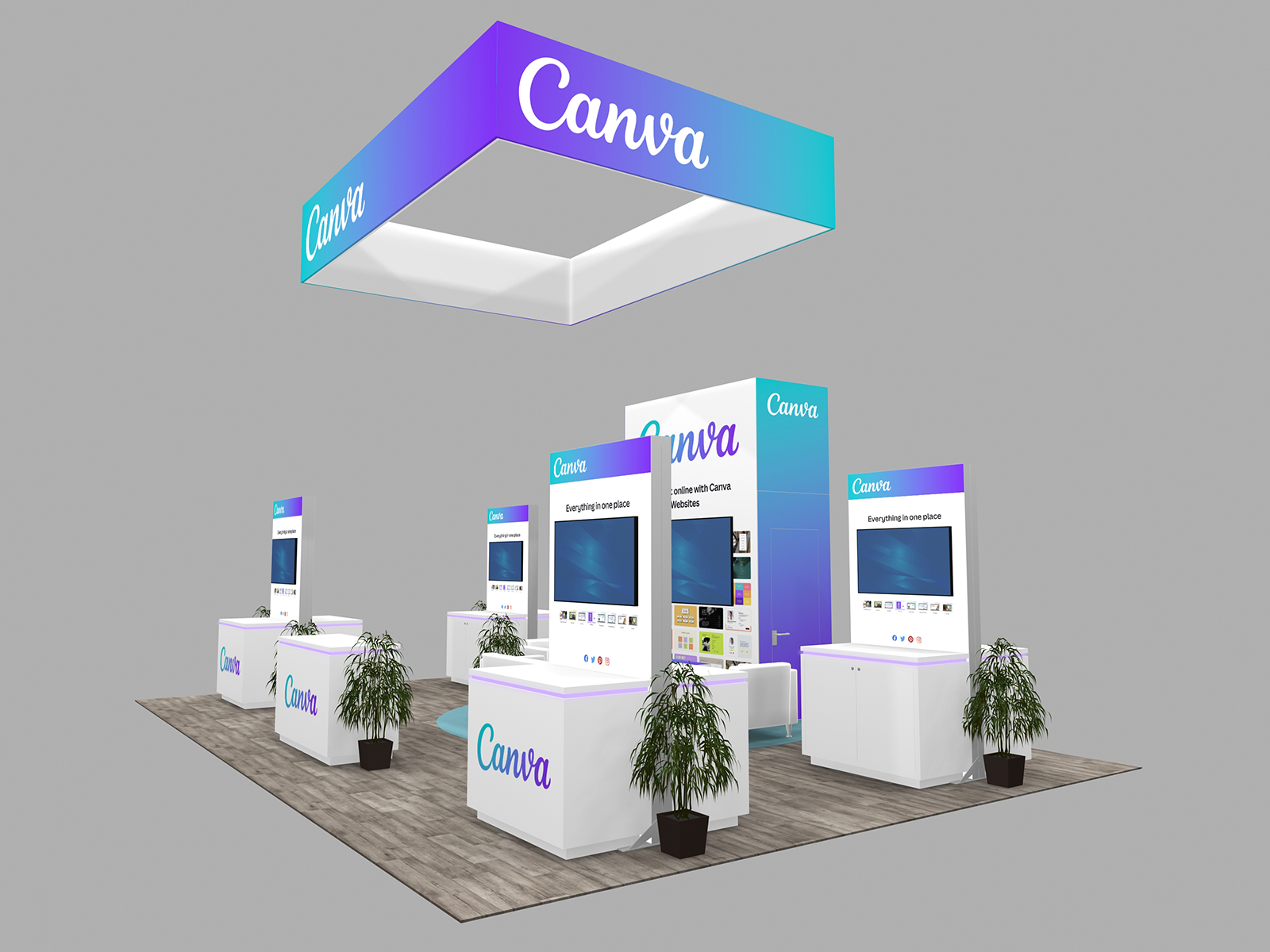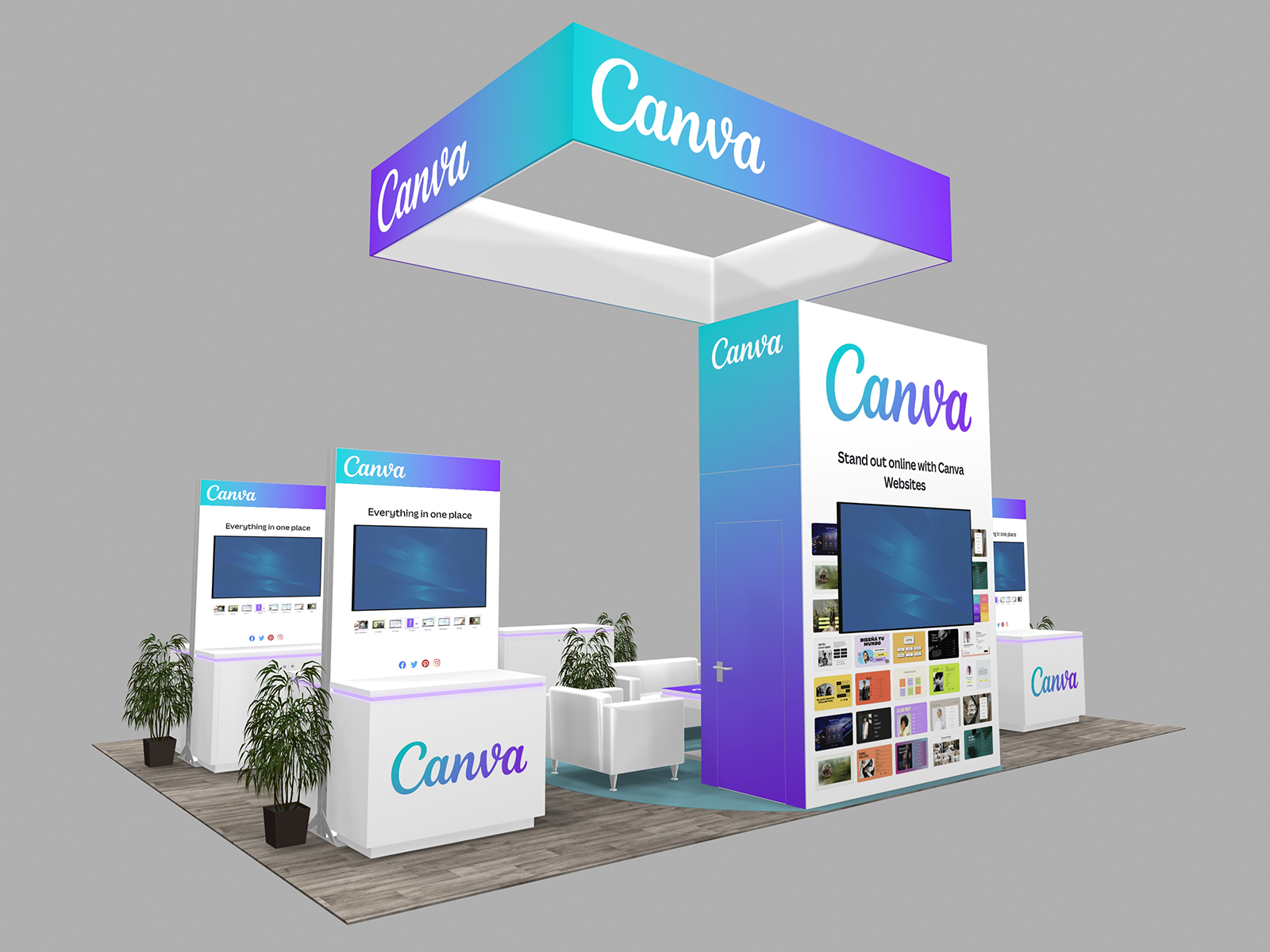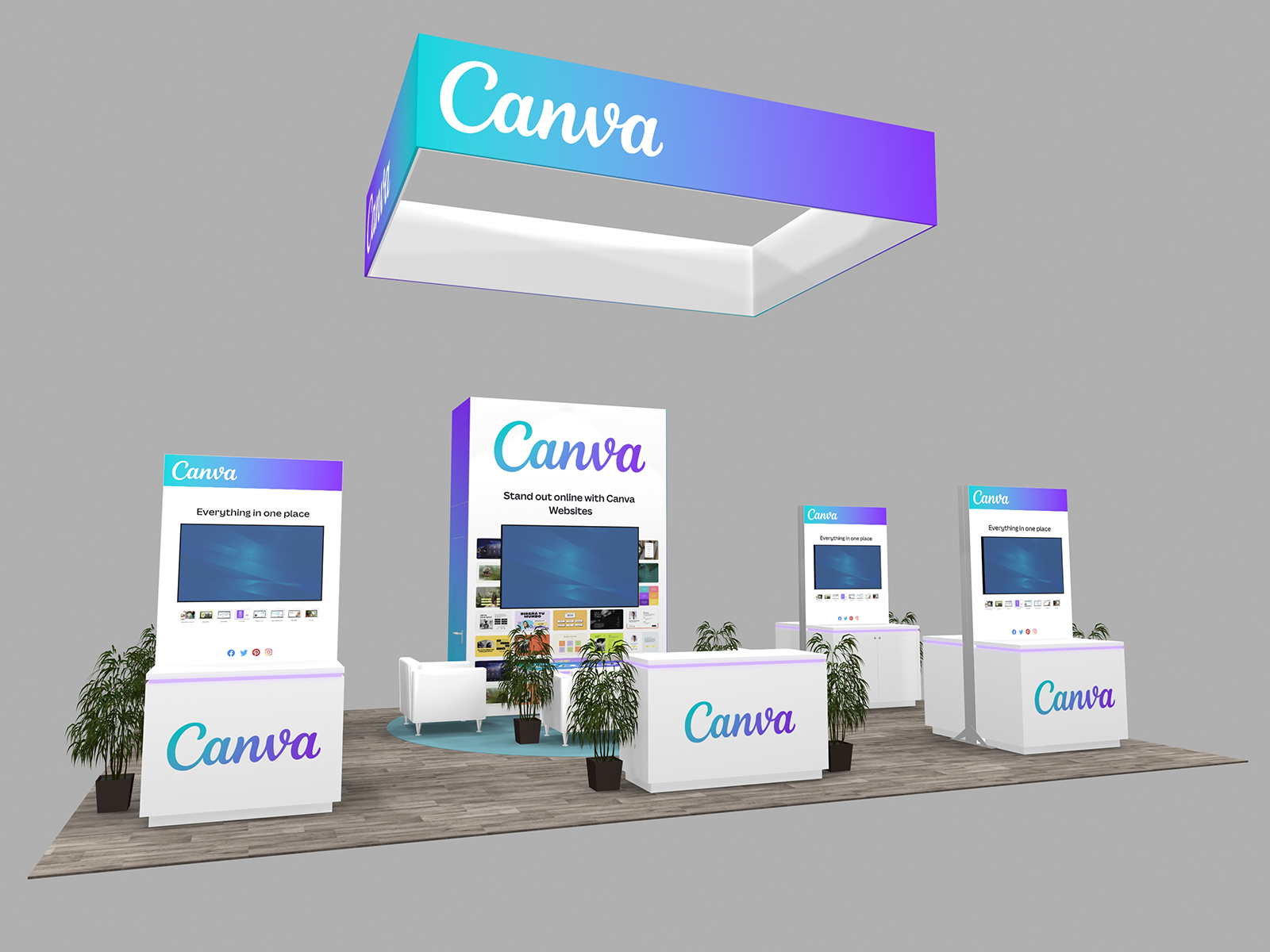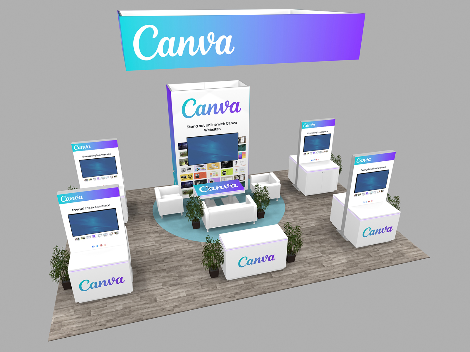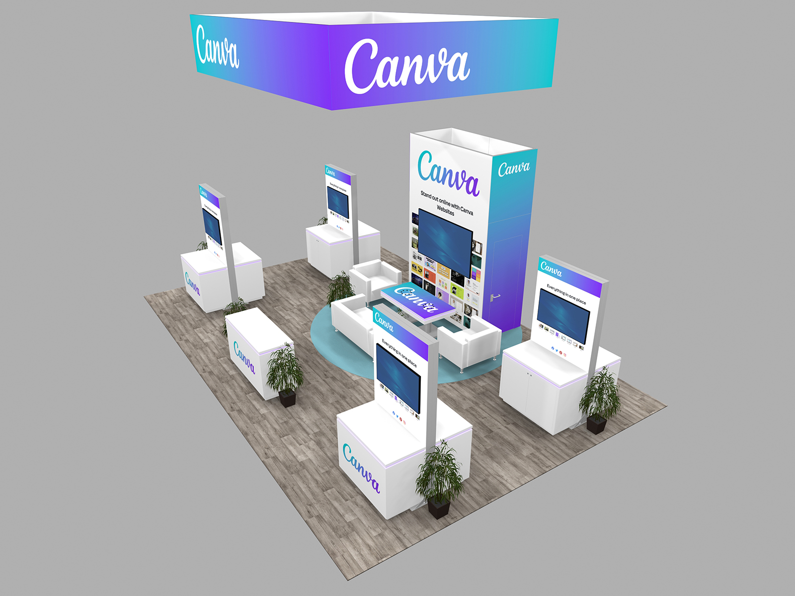 Comfortable and productive are rarely used together to describe a trade show exhibit design. Yet, the VK-5216, VK-5218 and VK-5218 series of 20 x 30 islands are perfect examples of how design can blend these two concepts into a stylish booth. They feature large format fabric graphics with backlighting, demo stations, and multiple monitors, The VK-5216 and VK-5217 have ceiling canopies with scrim fabric, whereas the VK-5218 has a rectangle hanging sign for increased visibility.