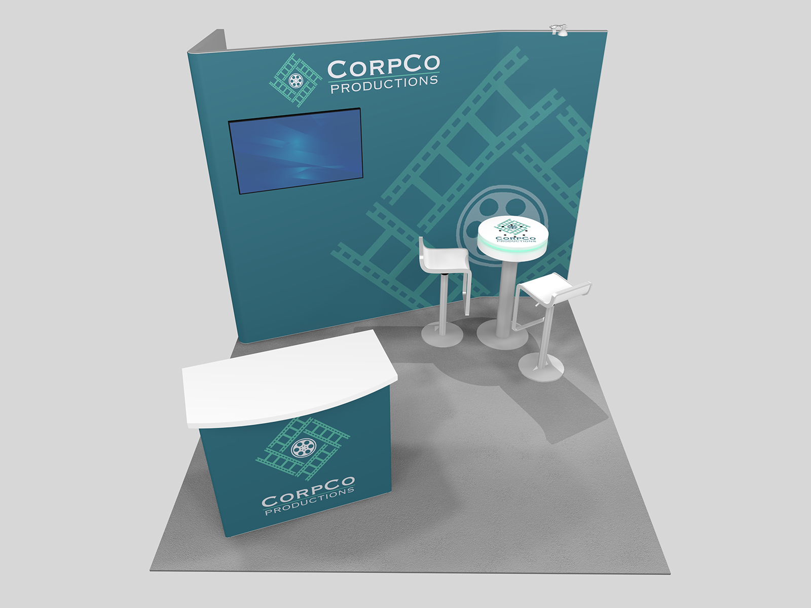Quite often, a few custom elements added to the design can give the entire design a custom look even if it’s as simple as some colorful laminated workstations, shelves, or a reception counter. Custom laminated soffits and backlighting are also nice touches that are inexpensive and well worth the investment. As a bonus, if you re-rent the same exhibit, your second rental will most likely be less expensive, since your first rental covered the cost of those custom components.