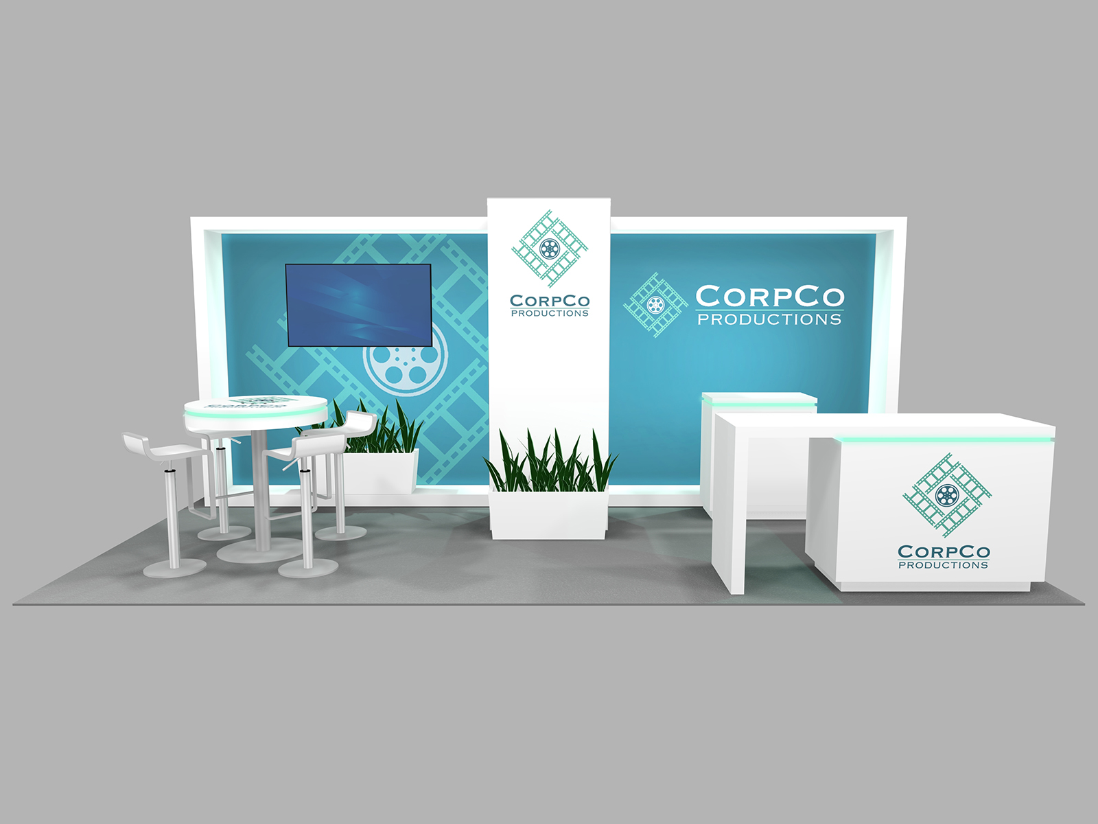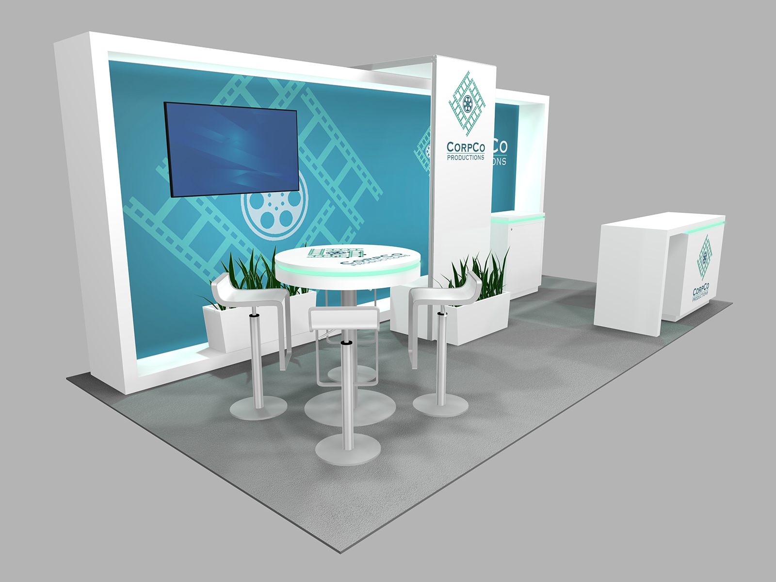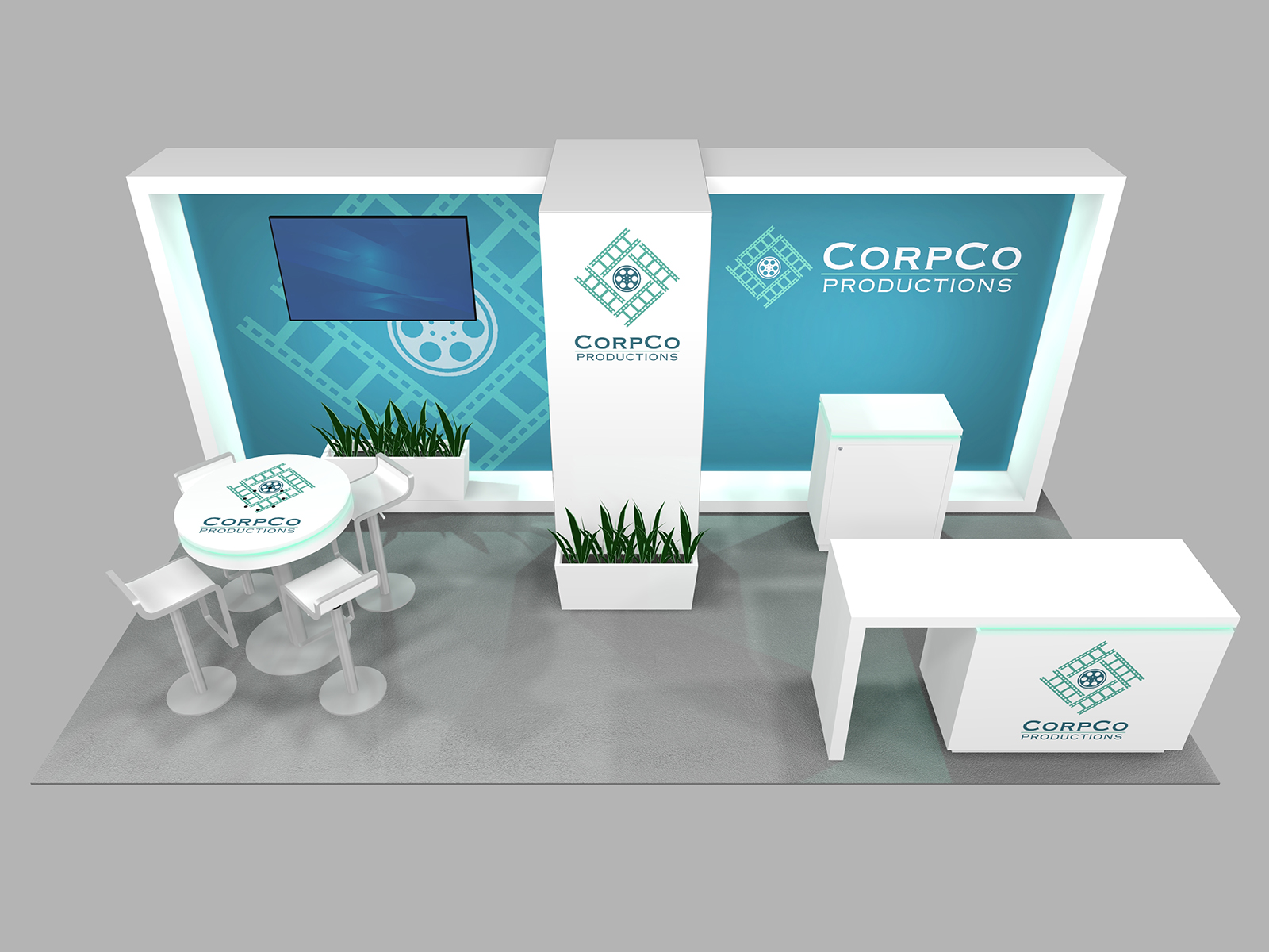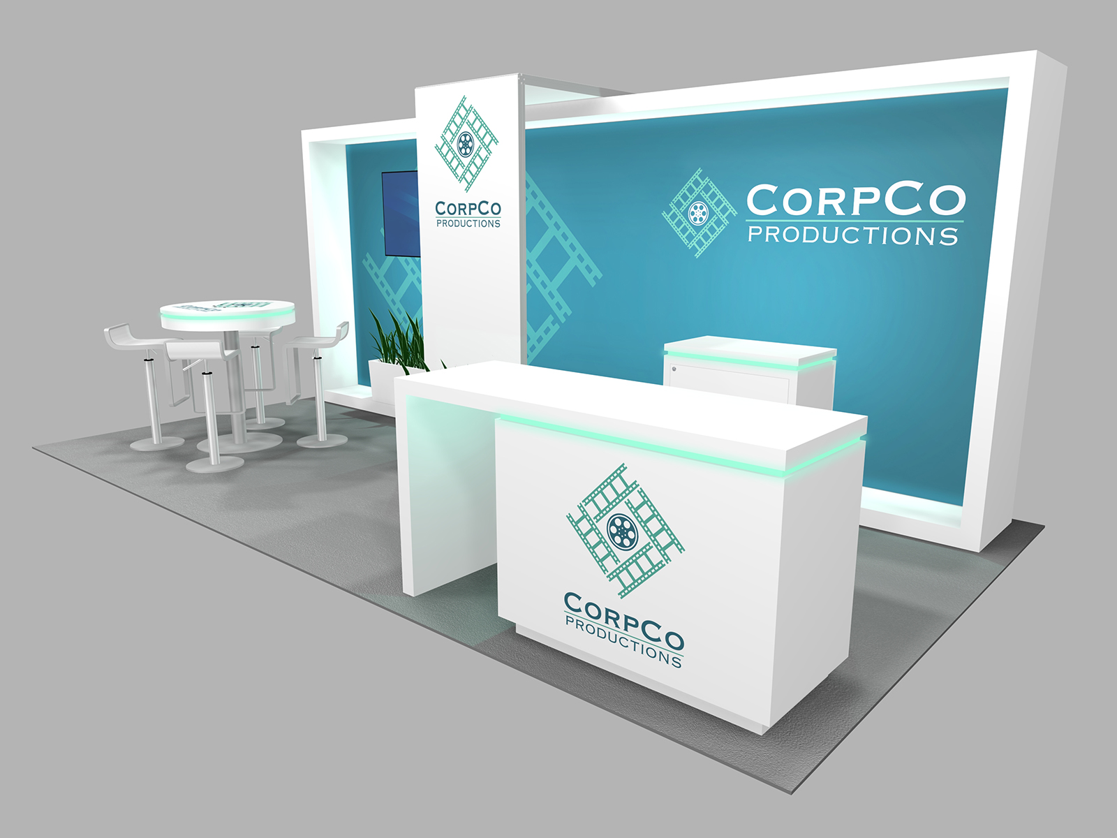 Quite often, a few custom elements added to the design can give the entire design a custom look even if it’s as simple as some colorful laminated workstations, shelves, or a reception counter. Custom laminated soffits and backlighting are also nice touches that are inexpensive and well worth the investment. As a bonus, if you re-rent the same exhibit, your second rental will most likely be less expensive, since your first rental covered the cost of those custom components.