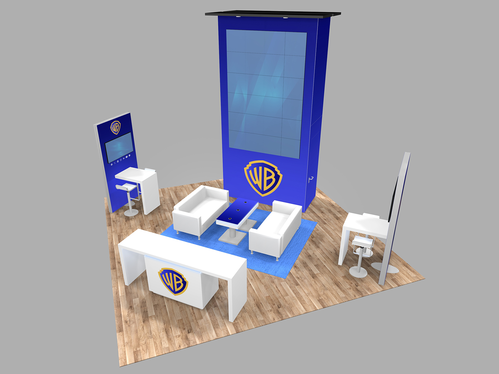 The 20 x 20 exhibit include seating, wireless charging, extensive storage, and monitor mounts. The base price excludes the video tiles since most exhibitors rent them from onsite A/V providers, which not only saves on shipping but ensures technicians are available at the trade show to handle the installation. Supercharge your trade show marketing with a modern rental exhibit that includes all the “bells and whistles.”