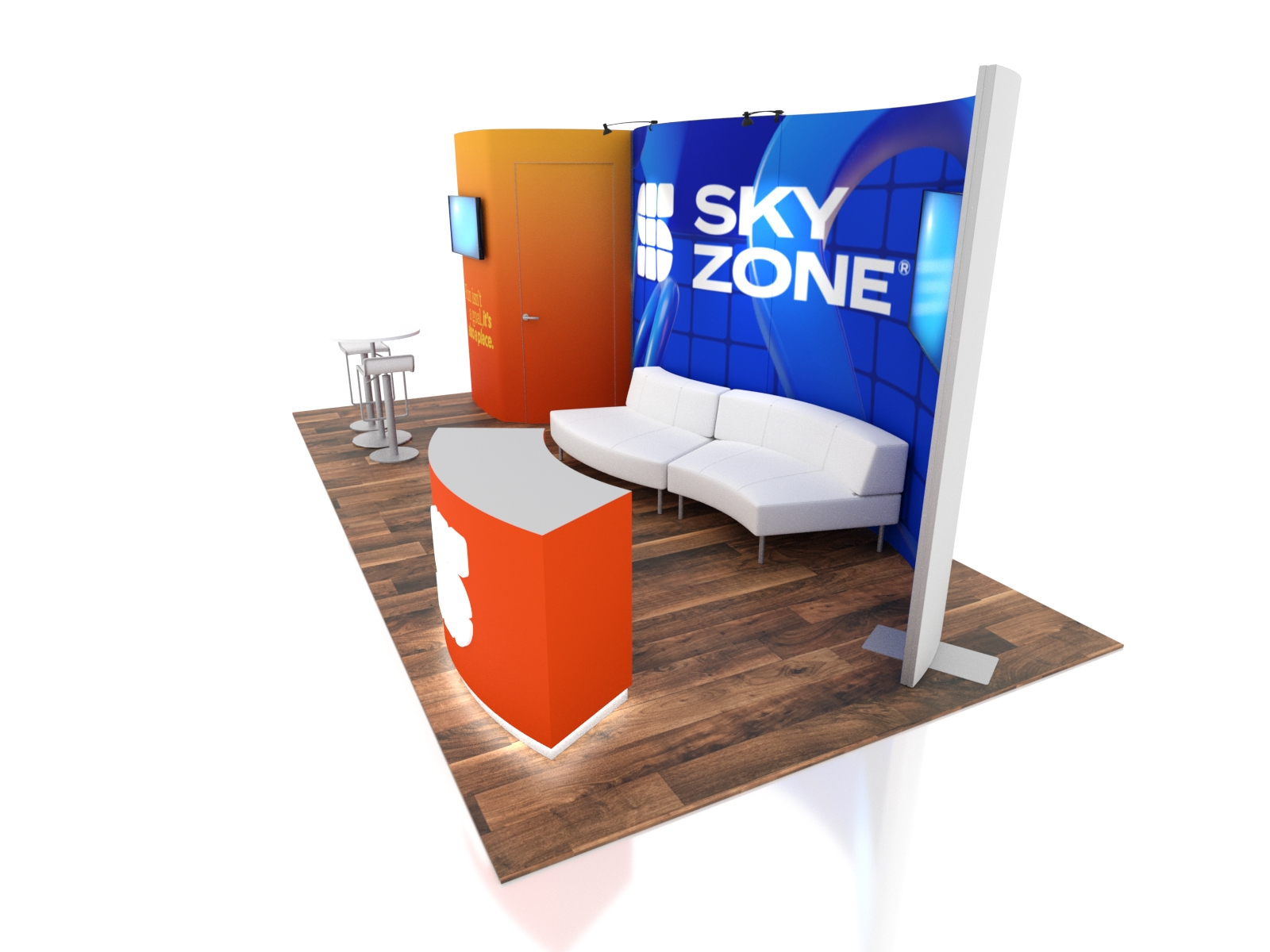 GK-2038 Gravitee Modular Trade Show Exhibit -- Image 1In a world of garish colors and impractical design, understated elegance stands apart in its ability to convey luxury. These exhibits transform simple curves into an inviting upscale setting with functional multimedia options. They include large monitor options, a seating area, and presentation/lounge areas. The reception counter offers ample storage and large graphics in a sweeping design that invites tradeshow attendees into your booth. Best of all, as your trade show schedule changes, the designs expand or shrink depending on your needs. Best of all with Gravitee Modular frames, assembly is fast and effortless, saving you time and money during installation and dismantle.
